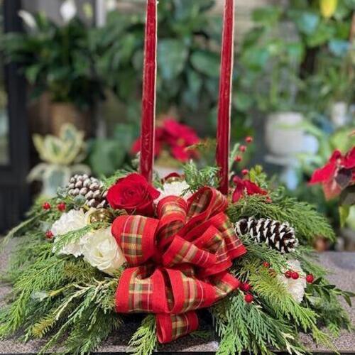 This elegant holiday centerpiece features a charming arrangement of lush evergreens, rustic pinecones, vibrant red berries, and candles. This design exudes a warm and inviting feel, perfect for enhancing your holiday table. The soft glow of the candles beautifully complements the natural elements, creating a cozy and festive ambiance for any gathering or celebration.